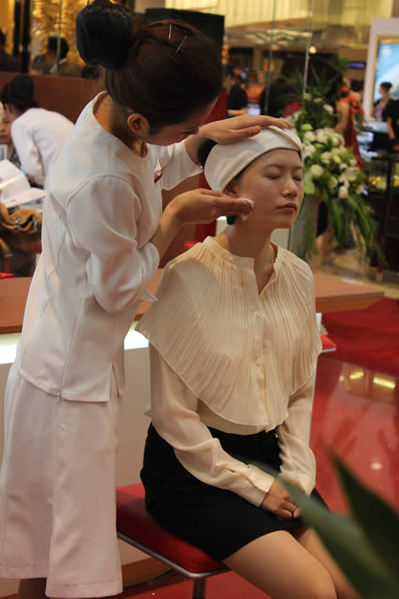 嬌韻詩專柜導購用專業(yè)手法為顧客現(xiàn)場做植物精華護理