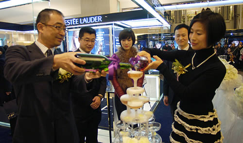 雙方領(lǐng)導(dǎo)共同為慶祝雅詩(shī)蘭黛盛裝入駐蘭州國(guó)芳百貨倒入香檳