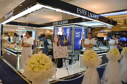 剪彩現(xiàn)場(chǎng),禮儀小姐為顧客展示雅詩(shī)蘭黛明星產(chǎn)品