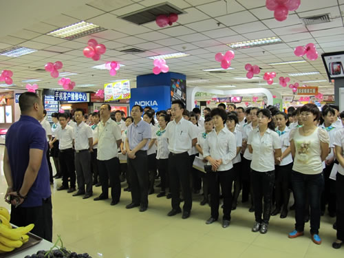 1、F1精品、化妝部主管向各位員工做店慶動員。