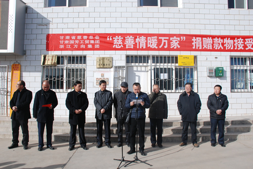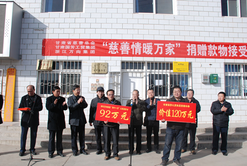 2016年1月21日由甘肅省慈善總會、甘肅國芳工貿(mào)集團(tuán)聯(lián)合開展的“慈善情暖萬家”捐贈物資接受發(fā)放儀式在青嵐山鄉(xiāng)大坪村隆重舉行。省慈善總會常務(wù)副會長張瑞堂同志、副會長張忠健同志,甘肅國芳工貿(mào)集團(tuán)副總經(jīng)理白海源先生,定西市政府副市長李斌同志及市區(qū)民政局、青嵐山鄉(xiāng)政府主要負(fù)責(zé)同志參加了儀式。省慈善總會聯(lián)合國芳工貿(mào)集團(tuán)籌措價(jià)值120萬元的衣物5100多件,資助青嵐山鄉(xiāng)3000多戶困難群眾,幫助他們解決穿衣方面的困難。