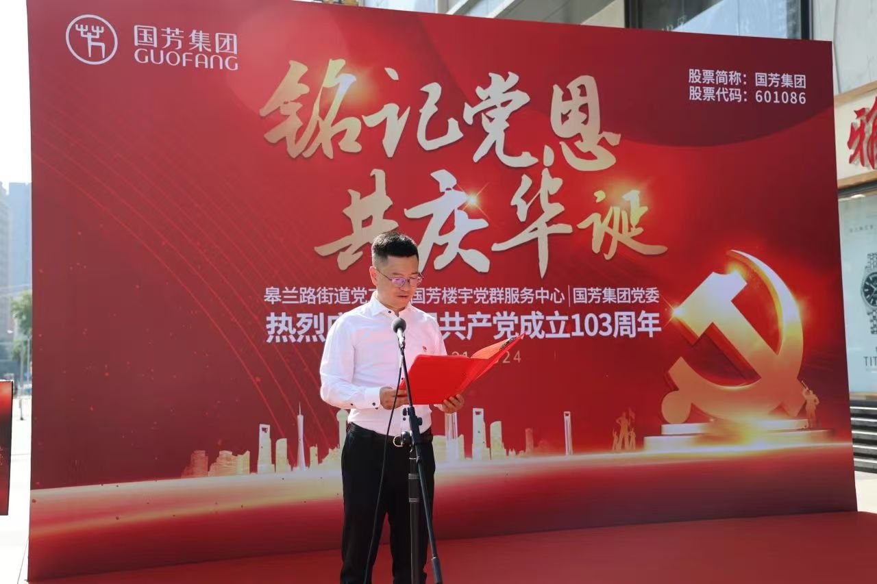 為慶祝偉大的中國(guó)共產(chǎn)黨建黨103周年,進(jìn)一步貫徹落實(shí)黨的二十大精神和習(xí)近平總書記關(guān)于黨紀(jì)條例學(xué)習(xí)教育的重要講話和指示精神,豐富黨員和員工文化生活,在七一建黨節(jié)即將來臨之際,國(guó)芳集團(tuán)黨委協(xié)同皋蘭路街道黨工委、國(guó)芳樓宇黨群服務(wù)中心入駐企業(yè)黨組織共同舉辦“銘記黨恩、共慶華誕”慶祝中國(guó)共產(chǎn)黨建黨103周年主題黨日活動(dòng)。